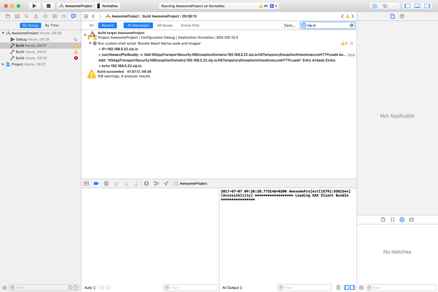 Open the Report navigator tab, select the last Build and search for IP= followed by an IP address. The IP address which gets embedded in the app should match your machines IP address.